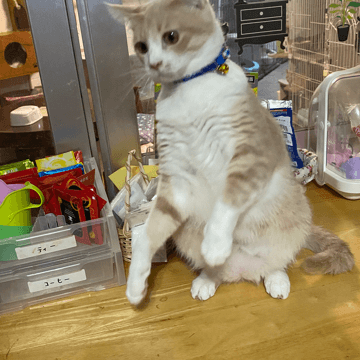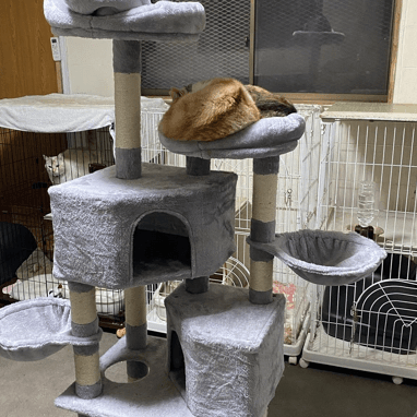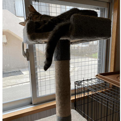 コンテナハウスの方からまた カラスのように泣くこえ みーた君、今日はキャットタワーの上に、リオ君かのっている、(2枚目) みーたは、そこ僕の場所と 叫んでた、 私が入っていったら ケージの角へ わがままボディ